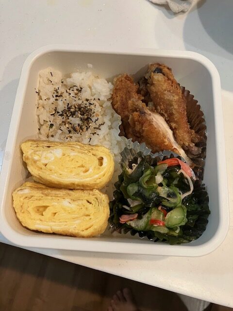 お弁当:手羽中のから揚げと酢の物と卵焼き