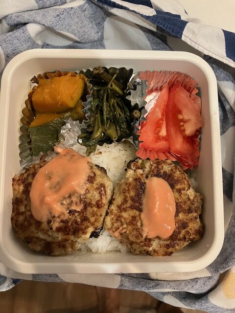 お弁当:豆腐ハンバーグとトマトと空心菜炒めとかぼちゃの煮炊きもん