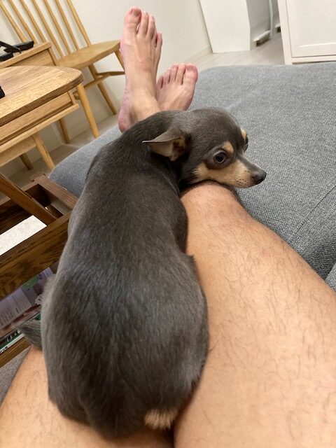 にこちゃんはチワワのスムースのブルータンホワイトのかわいいわんちゃんなんですが、性格はびびりで結構狂暴です