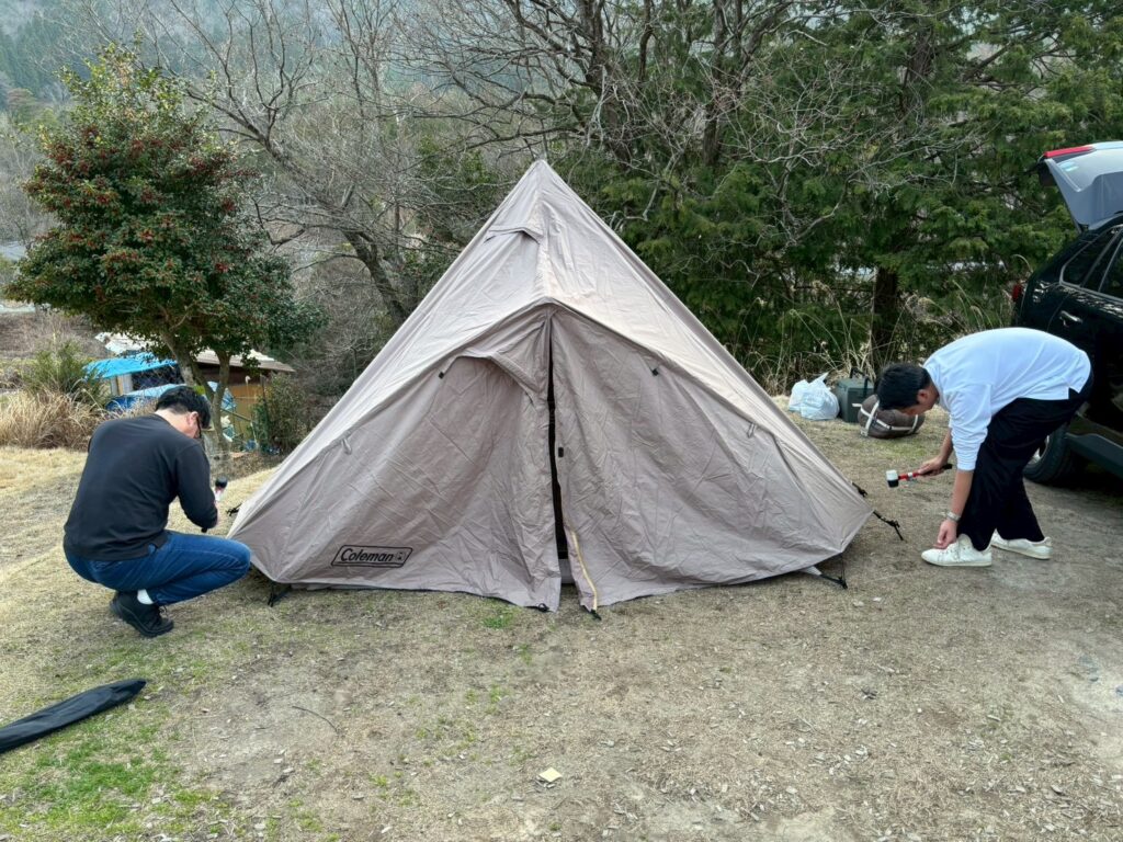 勝手なイメージでキャンプ場の運営されている人は地主じいさんみたいなイメージがあったのですが、気さくな洒落た兄ちゃんみたいな人達がスタッフさんでイケたキャンプ場でした。到着してすぐにまずはテントの設営に入りました。マッソとイナイレ君は何度かキャンプに行ったことがあるので割と手際よくテントを組み立てていました。