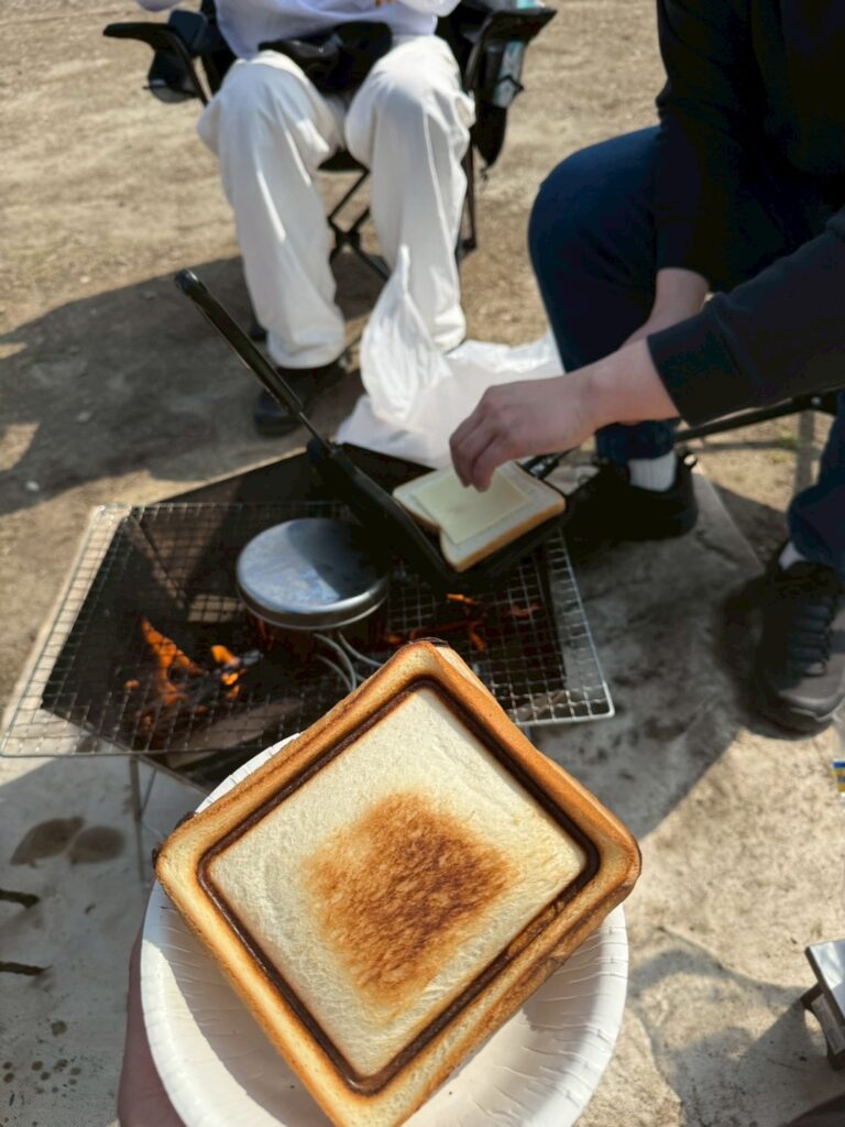 慣れない環境と雷のようなイビキによりあまり寝ることができませんでした。結局二度寝してどうにか体力回復。童話のような鳥の声に起こされ何とか起床。キャンプ朝ごはんの代表格ホットサンドを食べました。
