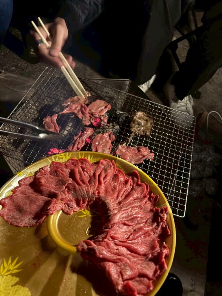 イナイレ君とマッソはこの作戦で火おこしを何度も成功に導いてきたそうなのですが、、、。今回はうまくいかず。豚トロを焼くのにもだいぶ時間がかかってしまいました。結局しっかり火が安定したのは完全に日が落ちてからでした。火が安定してからは食材をガンガン焼きました。タンとかハラミとかとりあえずメジャーどころのお肉をたくさん食べました。