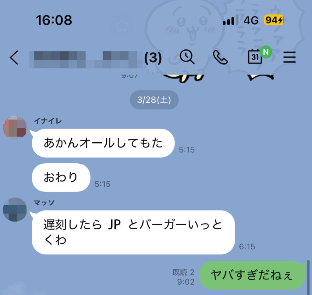 お昼集合だったので当日僕はゆっくり目の起床でした。ライン通知が来ていたのでチェックしてみると午前5:15にイナイレ君がラインしていました。